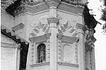 Еще одним примером восточных мотивов фасадов церквей в Иркутской области является Церковь Сретения в селе (и остроге) Бельска на Белой реке. Построенная после 1788, эта, ныне лишенная крыши, церковь проста по форме (только один ярус), но имеет интересные декоративные панели над главными окнами (фото 13). Эти панели включают четко обозначенную форму храма в виде ступы . Как бы то ни было, документальные свидетельства, объясняющие присутствие этих форм у сельской церкви обнаружены не были.35 Та же форма появляется в Иркуктской церкви Троицы, построенной во второй половине 18 века и посвященной в 1778 (фото 14). |
