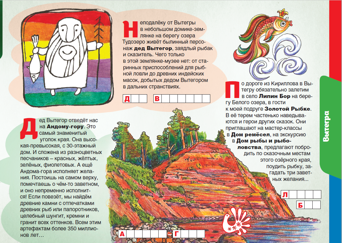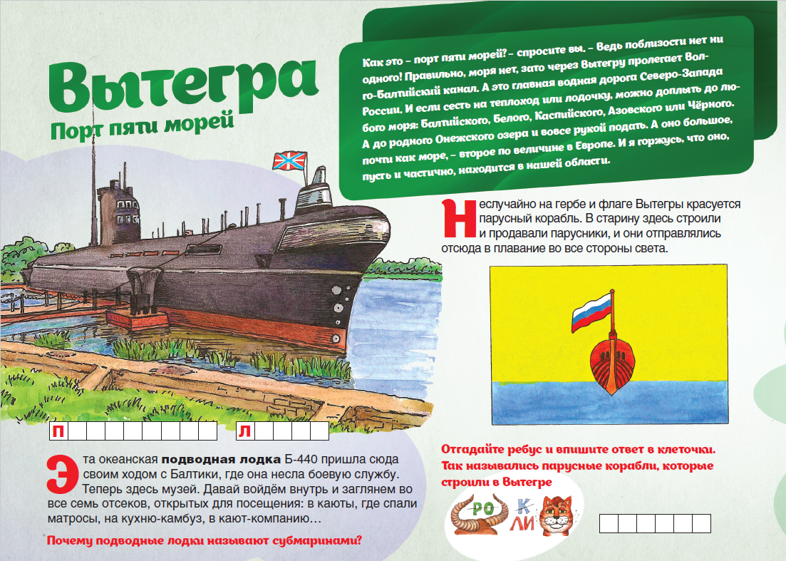Изучай Вологодчину по «Детскому путеводителю»! Отправляйся в «порт пяти морей» – Вытегру. Как из города, близ которого нет ни одного моря, можно доплыть до Балтийского, Белого, Каспийского, Азовского и Чёрного морей? А еще интересно узнать, что в Вытегре делает океанская подводная лодка, какой высоты Андома-гора и кто живет на берегу Тудозера.