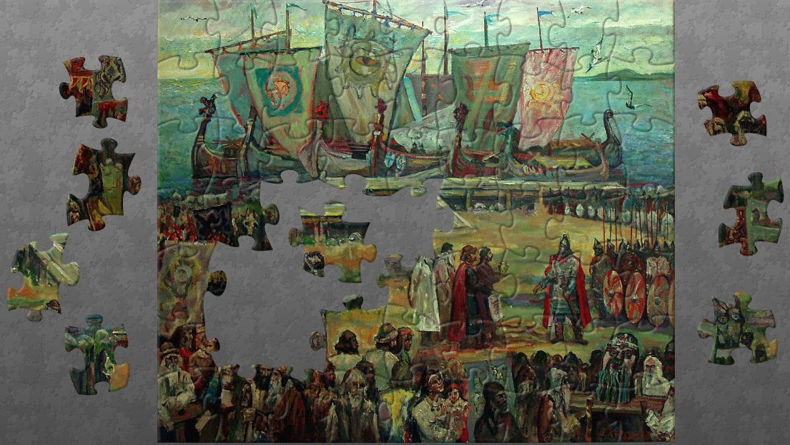 Собери арт-пазл, созданный по картине известного вологодского художника Владимира Корбакова «Приход Синеуса на Белоозеро». Переходи по ссылке и играй онлайн – тебе понравится!