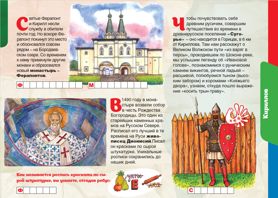 Изучай Вологодчину по «Детскому путеводителю»! Сегодня держи путь на запад нашего края, на святую кирилловскую землю. Узнай, почему Кириллов называют Северной Фиваидой, какой из монастырей является одним из крупнейших в Европе, какой из них внесён в список Всемирного наследия ЮНЕСКО благодаря уникальным росписям, а ещё почувствуй себя древним русичем в древнерусском поселении «Сугорье».