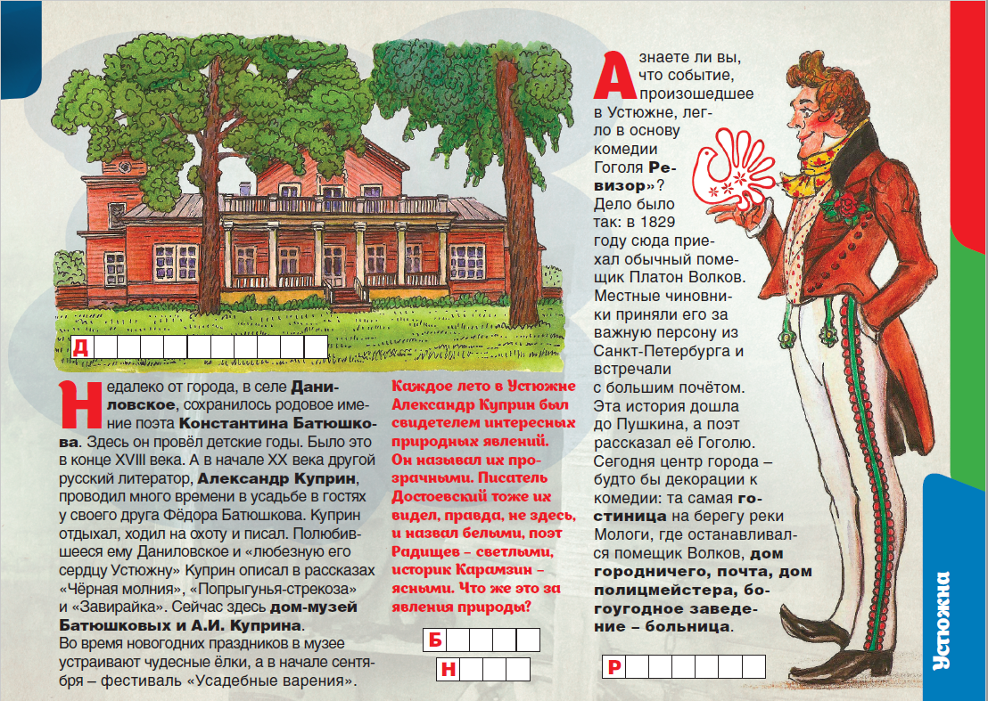Изучай Вологодчину по «Детскому путеводителю»! В завершении путешествия по Вологодской области знакомься с одним из исторических городов России – Устюжной. Узнай, почему Устюжна, расположенная в болотистой местности, долгое время называлась «железнопольской». А заодно выясни, какое отношение к этому городу имеет известная комедия Николая Гоголя «Ревизор».