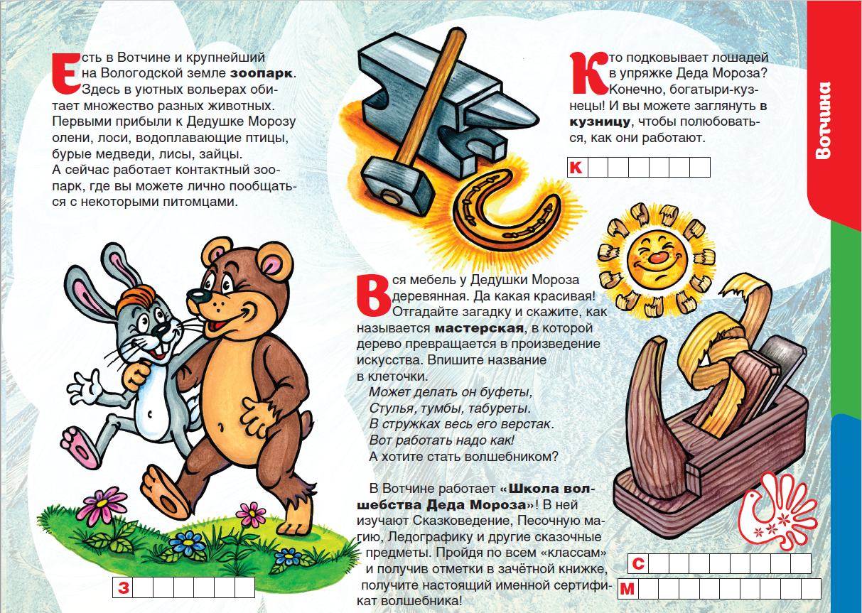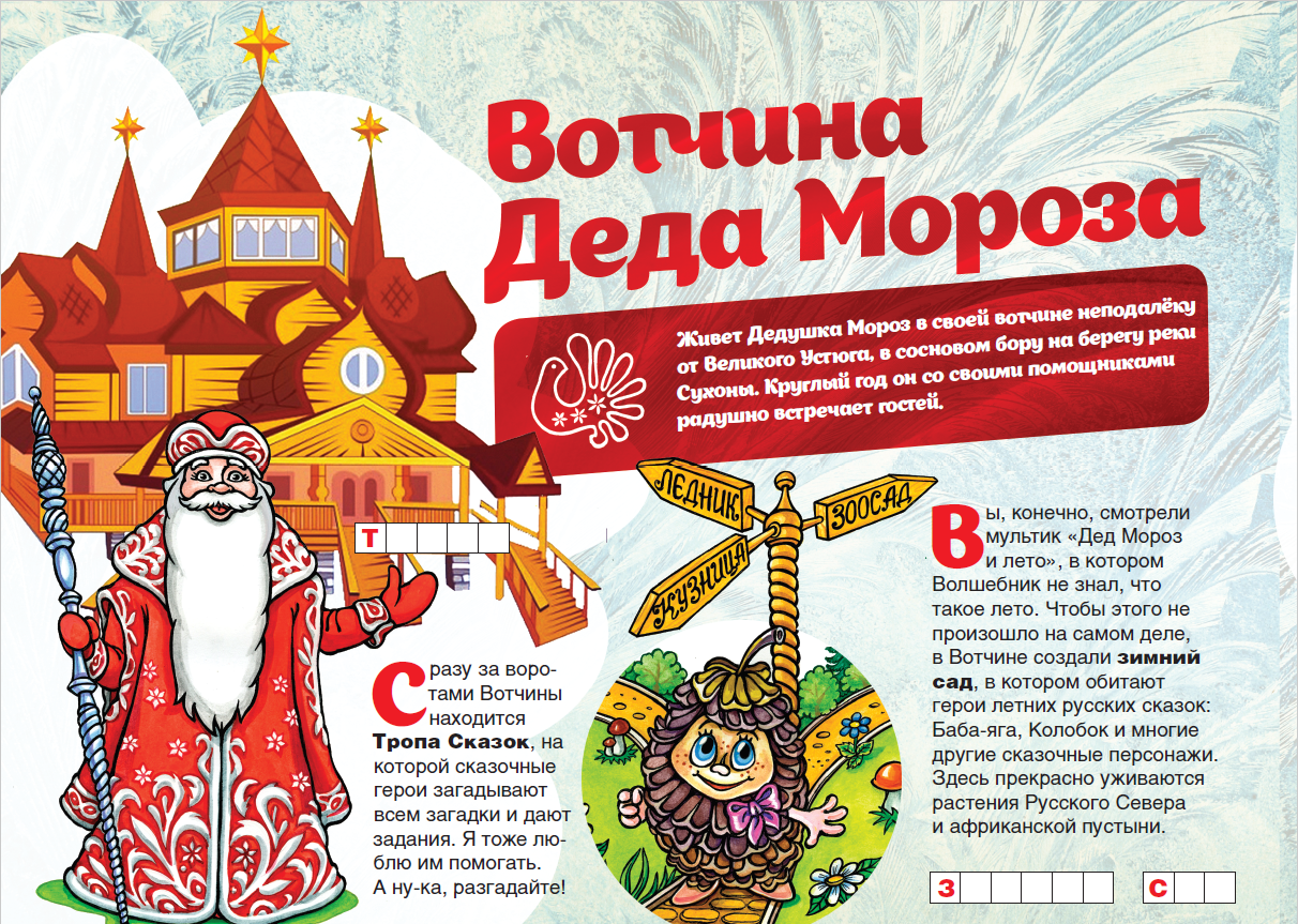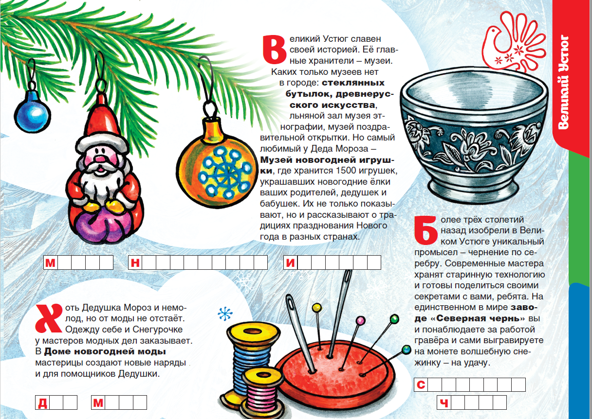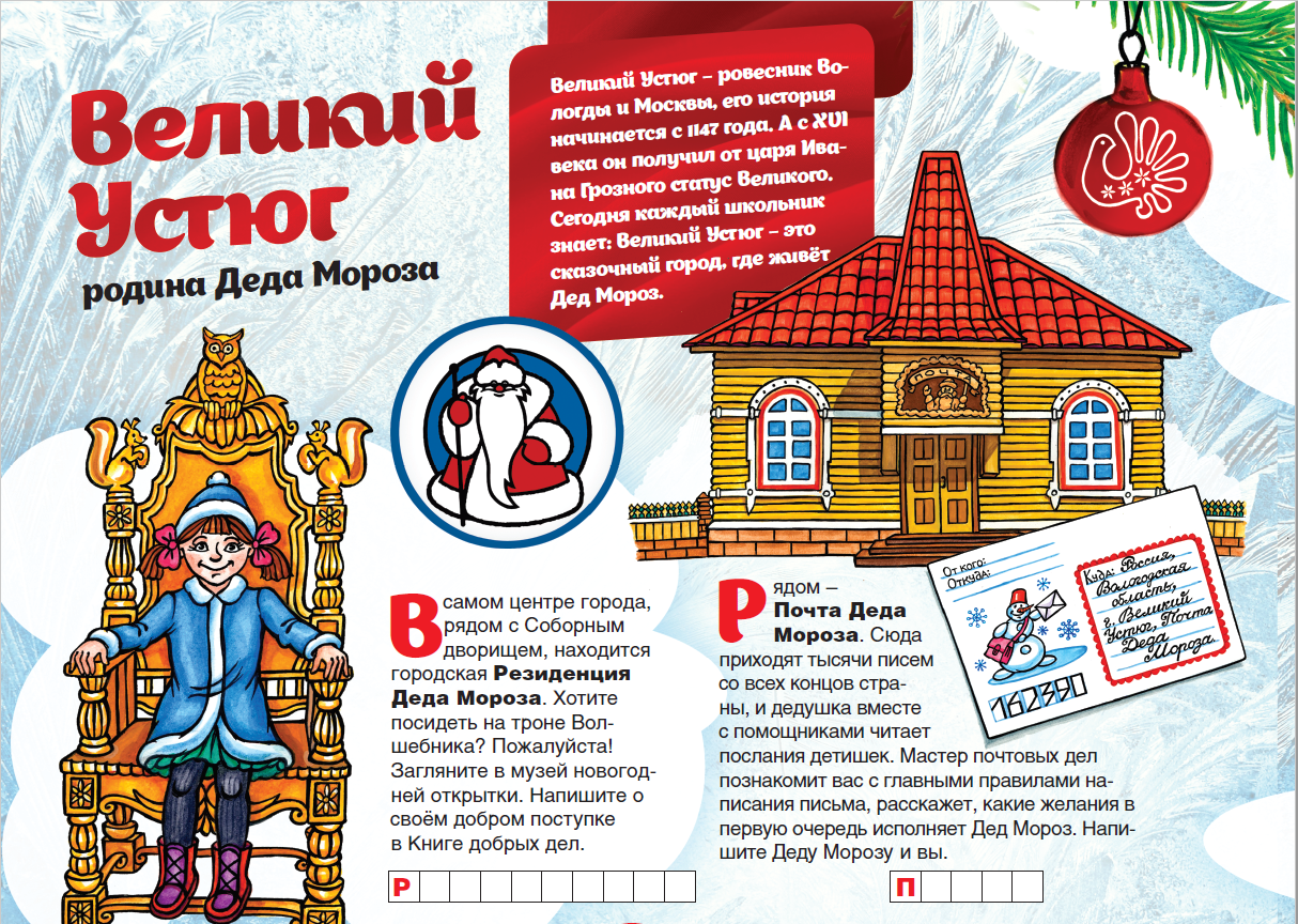 Изучай Вологодчину по «Детскому путеводителю»! Сегодня отправляйся в Великий Устюг, в гости к Деду Морозу. Со страниц путеводителя узнай, где живёт и исполняет самые заветные желания главный зимний волшебник, какой из музеев его самый любимый, и, конечно, познакомься с чернением по серебру – уникальным промыслом, технология которого хранится в строжайшем секрете.