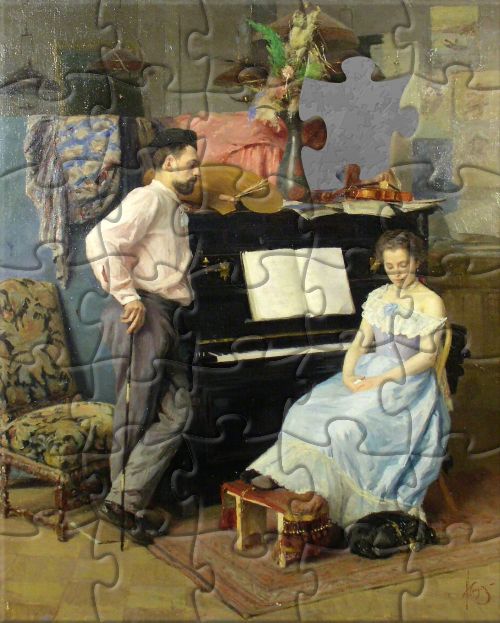 Собери арт-пазл, созданный по картине художника Михаила Игнатьева «Художник с невестой». Переходи по ссылке и играй онлайн – будет увлекательно!