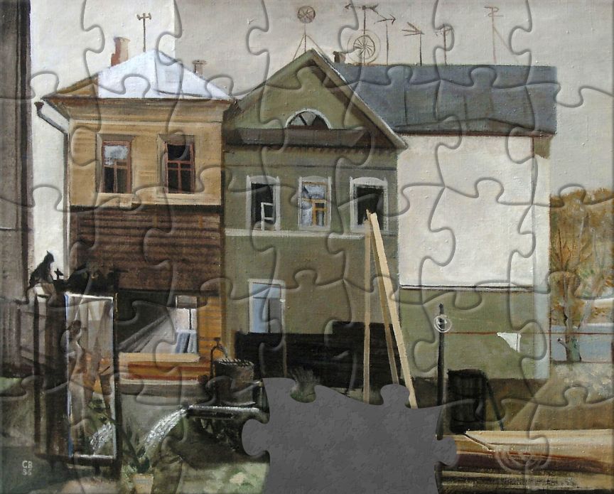Собери арт-пазл, созданный по картине известного вологодского художника Сергея Веселова «Ремонт старого деревянного дома». Переходи по ссылке и играй онлайн – тебе понравится!
