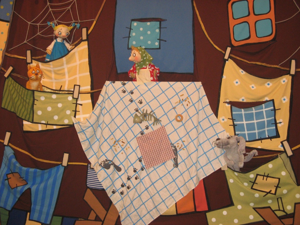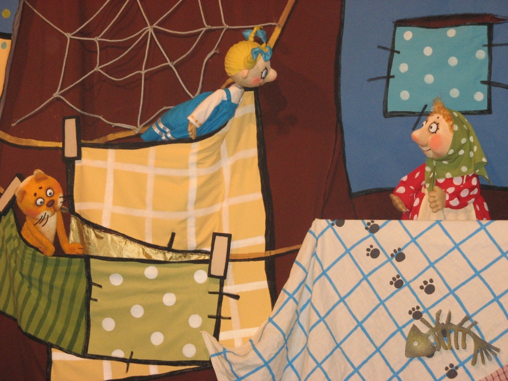Спектакль сделан в традиционном для кукольного театра приеме – это ширмовой спектакль с верховыми куклами. Пятьдесят лет назад, когда создавалась первая кукольная кафедра в Ленинграде, началось активное внедрение в кукольную практику так называемого живого плана: человек и кукла на открытой сцене. В техническом отношении это проще – вышел на сцену и играешь куклой: можешь полететь, нырнуть, не нужно думать, какая декорация и как спрятать артиста. А за ширмой приходится придумывать особую технику, разные крючочки, петельки, нужно быть очень изобретательным. Кстати, в вологодском театре замечательные мастерские, и качество выполнения работ заслуживает высокой похвалы. А спектакли с живым планом стали сейчас настолько распространенными, что ширменные, традиционные уже кажутся оригинальными.