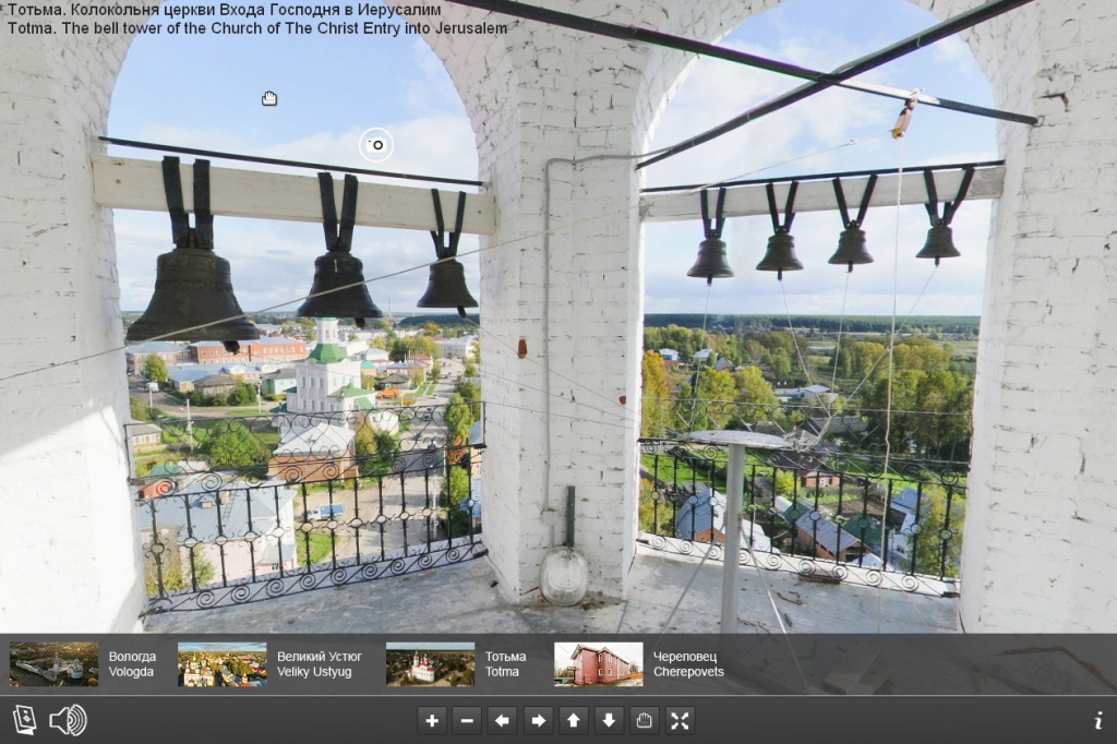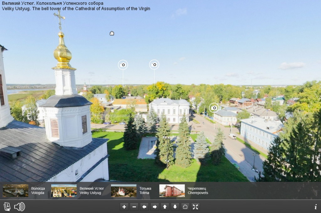 Цель этого проекта – показать средствами, доступными в виртуальной реальности, экспозиции музеев Вологодской области, в том числе те подлинные предметы, которые недоступны обычному посетителю, и на этом материале раскрыть тему российско-американских связей. География проекта в пределах региона широка – Вологда, Тотьма, Великий Устюг, Череповец. Эти исторические поселения предстают перед нами во всей красе: мы видим прекрасные панорамы Вологды, Тотьмы и Устюга с высоты птичьего полета. Эти уникальные виды – результат применения очень интересной технологии: на воздушном змее с помощью специальной конструкции укрепляется фотоаппарат, делается сложная по структуре панорамная съемка, а затем из множества фотографий «сшивается» виртуальная панорама, по который мы можем путешествовать, разглядывая окрестности, приближая и удаляя изображение. Это дает эффект непосредственного присутствия и очень эмоционально привлекательно! Даже если вас совершенно не интересует, как Вологодская область связана с Америкой, вы можете просто с удовольствием посмотреть на эти города с такой точки зрения, с какой их почти невозможно увидеть в реальности. И в то же время можно «взглянуть» на Тотьму с колоколен двух тотемских церквей, на Устюг – с колокольни Успенского собора, а уж эти впечатления можно проверить в действительности. И это обязательно захочется сделать!