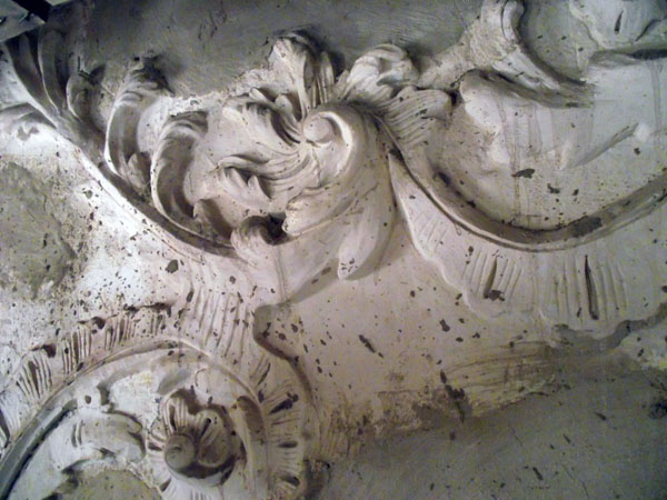 К сожалению, работы проводились в очень сжатые сроки, поэтому не была запланирована реставрация живописи и богатой рокайльной лепнины на сводах, для работы с ними нужны особые технологические условия, в частности, стабильный температурно-влажностный режим. Лепные розетки и картуши в церкви выполнены не так, как обычно, когда элементы отливаются в формах в мастерской, а потом монтируются на место. Здесь скульпторы-лепщики – их называли «снецари» – лепили сложные рельефы на стенах и сводах прямо на месте, с лесов, нанося алебастр и гипс на вбитую в стены арматуру, – виртуозная ручная работа. Такого рококо у нас немного – например, в Иосифовском корпусе Вологодского архиерейского подворья, в церкви Иоанна Златоуста на Набережной VI Армии в Вологде. Но в церкви Спаса Всемилостивого декор имеет много утрат и требует срочной реставрации или, по крайней мере, консервации.
