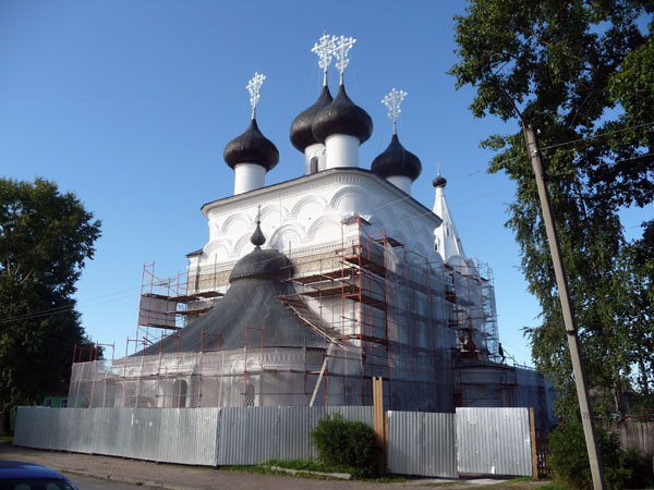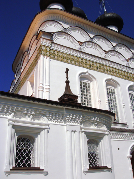 Церковь очень красивая, я ею просто любуюсь! Сейчас вокруг нее плотная застройка – нет простора, чтобы ее увидеть. Но замечательный вид на церковь открывается с вала. Это необыкновенно цельный и гармоничный памятник, пропорции его великолепны. Церковь очень интересна также своими декоративными элементами: затейливое барочное завершение алтарных апсид, двухъярусный фриз из ложных закомар и изразцовый пояс создают неповторимое впечатление «украшенности». Если сравнить церковь, например, с вологодским Софийским собором, который я тоже очень люблю, – мощным, монументальным, полным энергии, – то она выглядит удивительно нежно, «по-женски», как будто в кружевах.