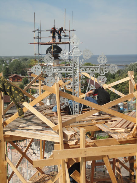 Кроме консервации конструкций фундаментов, стен и стропильной системы, выполнен большой объем работ по реставрации декоративных элементов. Вычинен изразцовый фриз. Защищен от разрушения пояс из закомар – они окрыты медью. Заменены фрагменты из просечного металла на крестах, причем их не снимали – восполняли на месте, с лесов. Какой вид с уровня крестов открывался!.. Панорама всего Белозерска!.. Большая часть столярных изделий, выполненных в XX веке, заменена – в церкви теперь новые оконные рамы и двери. Проведена консервация внутренней двери из притвора в трапезную – она полностью подлинная, включая металлические кованые детали. Все это – столярные и штукатурные работы, побелка, белокаменные полы, кровля – сделано за один сезон. Теперь и фундамент, и опоры достаточно прочны, в церкви сухо и дышится легко, она наполнилась светом и воздухом.