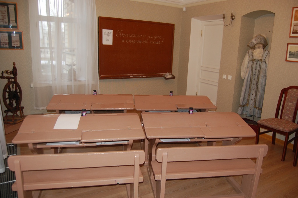 Да, сейчас таких экспозиций три. Выставка «Старинная школа» изначально создавалась как площадка для интерактивных музейных занятий. Экспонаты для нее собирались, что называется, с миру по нитке: многие вещи, например, деревянные счёты, чернильницы-непроливайки, сотрудники принесли из дома; четыре парты с откидными крышками подарил нам директор школы поселка Мякса. Правда, парты эти 40-х годов прошлого века, но мы знаем, что более ста лет их конструкция практически не менялась. Приходя на выставку, дети получают возможность живого соприкосновения со старинной школой. Они могут сесть за парту, взять в руки гусиное перо, посчитать на счётах, даже постоять на горохе. Здесь проводятся интереснейшие музейные уроки для младших школьников.
