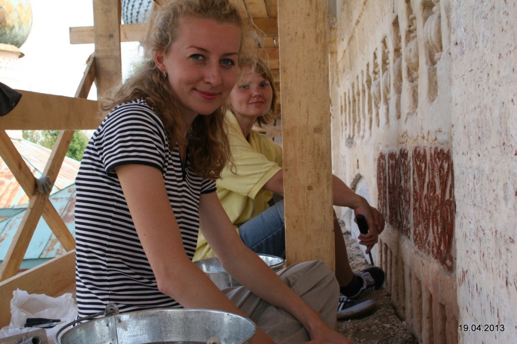 Кроме того, мы впервые провели реставрационные работы на внешних украшениях храма. По нижней части барабана и по самому собору идет пояс из керамических плит, которые при побелке стен всякий раз покрывались дополнительным слоем извести. Сейчас эта известь удалена, и посетители музея могут видеть, как это выглядело первоначально. Это плиты с травным орнаментом, покрытые защитным слоем – ангобом, и поверх ангоба киноварью нанесен рисунок. Снизу, конечно, детали рисунка не видны, но эта розоватая полоса очень оживляет стену.