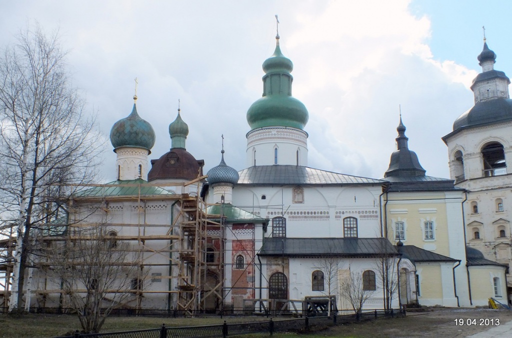 В Кирилло-Белозерском монастыре большое количество наружных фресок – это святые врата с самым крупным на севере монументальным комплексом и небольшие композиции на внешних стенах Успенского собора, церкви Преображения и ряда других построек. Но Успенский собор – это единственный храм в Кириллове, который расписан изнутри.