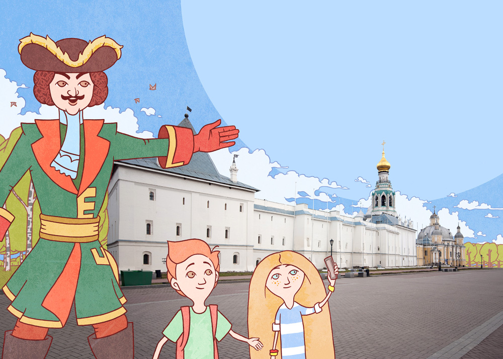Ю.В.: Структуру и сюжет детской книжки-раскраски с элементами путеводителя мы начали разрабатывать в сентябре 2012 года. Лубочная картинка переживала расцвет в петровское время, и самые известные картинки, которые затем переиздавались на протяжении нескольких столетий, были связаны с эпохой Петра I. Поэтому возникла идея: при помощи рассказа о визитах Петра I в Вологду связать с лубочной картинкой историю дома купцов Гутманов – первого музея Вологды. Название раскраски-путеводителя – «Сказ про то, как царь Петр в Вологде побывал». В повествование включены персонажи – современные дети Катя и Петя, так как музей в своих экскурсиях ориентирован в первую очередь на детскую аудиторию. Они встречают Петра I и рассказывают ему, что же сейчас находится в доме купцов Гутманов, где он останавливался 300 лет назад, и как изменилась Вологда за это время. Художник Сергей Трубников нарисовал десять лубочных картинок для раскрашивания. Картинки мы сделали в виде отдельных листов, чтобы понравившуюся картинку можно было не только рассматривать и раскрашивать, но и повесить на стену, как раньше развешивали лубочные картинки. Над рисунками в путеводителе работал художник Антон Квасоваров (группа «МАШ РУМ»).
