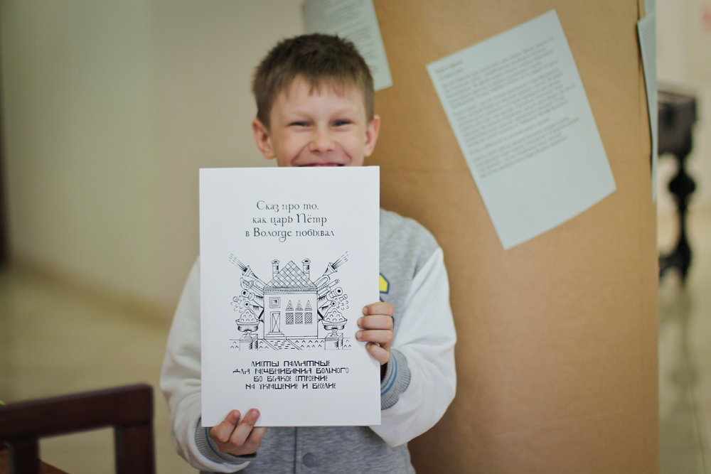 Ю.В.: Широта научной темы и собранного материала позволила методически разнообразно работать с несколькими целевыми аудиториями, в том числе с людьми с ограниченными возможностями. Абонемент и мастер-класс по лубку в музее можно проводить как самостоятельную программу, без привязки к выставке. Созданный нами «Сказ про то, как царь Петр в Вологде побывал» в десяти лубках стал частью истории первого музея Вологды, Дома-музея Петра I, у которого появилась и специальная сувенирная продукция: открытки и раскраска-путеводитель для детей. Часть выставки, работавшей в Юго-Западной башне Вологодского кремля, будет показана в тех городах, музеи которых стали участниками проекта. Первым ее принял Белозерский областной краеведческий музей. Возможно, в будущем полную экспозицию по лубку можно будет представить в мультимедийном формате, так как музей активно работает над представлением своих коллекций и проектов в виртуальном пространстве.