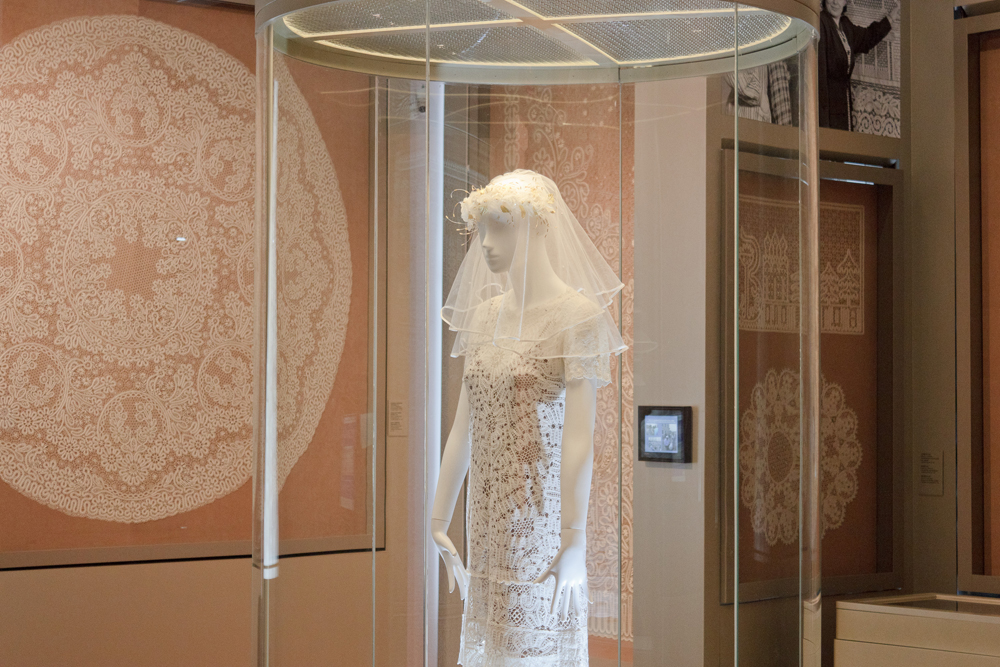 Основная экспозиция музея, построенная в хронологическом порядке, находится на втором этаже и занимает восемь залов. Показ начинается с демонстрации европейского кружева – кружевных предметов и инструментов из Франции, Бельгии, Германии, Польши, Словакии, Испании. Далее экспонируются образцы золотного кружева – наиболее ранние памятники, датируемые XVII – XVIII вв. Этнографические предметы, орнаментированные крестьянским мерным кружевом, иллюстрируют развитие кружевоплетения в Вологодской губернии XIX – начала XX вв.