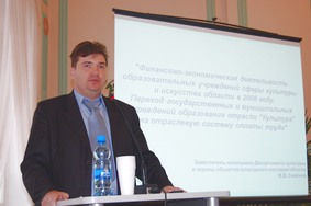 Вопросы сотрудничества АУК ВО «Вологодская областная государственная филармония имени В.А. Гаврилина» и муниципальных учреждений культуры и образования в новых экономических условиях прозвучали в докладе генерального директора филармонии Валерия Петровича Гончарова.