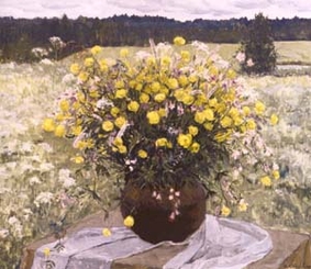 В натюрмортах художника пышные букеты полевых цветов