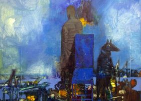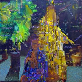 Назвать манеру письма Юрия Соломкина своеобразной слишком легко, и это ни о чем не скажет. Каждый художник, которому есть что поведать миру, своеобразен и неповторим. Но своеобразие Соломкина – особого рода. Для его стиля характерны лаконичность и схематизм эскизов театральных декораций, когда одного намека достаточно, чтобы вообразить и место, и время действия, и его эмоциональную тональность. Некоторые картины чем-то похожи на старинные фрески, случайно обнаруженные на древней стене под слоем штукатурки и бережно открытые в ряде фрагментов, и то, что мы не видим картину целиком, не скрывает от нас ее смысла, а, напротив, делает эту недосказанность еще более значительной. Другие полотна ошеломляют яркостью и невероятным сочетанием цветов – такого светящего синего, например, или прозрачно-желтого, или глухого лилового нет, наверное, больше ни у кого. А темно-бордовое ночное небо над африканской пустыней поражает глубиной и тайной, и ты понимаешь, что такое оно и есть, это далекое небо неведомых краев… Есть картины, напоминающие многоцветную мозаику или лоскутное шитье, но эта многоцветность и пестрота удивительным образом создают ощущение единства и целостности, которое, к слову, относится и ко всей совокупности работ, представленных на выставке «Опасность и Удовольствие»… Стоп! А почему, собственно, она так называется? Попробуем разгадать эту загадку…