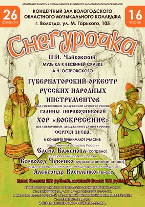 25 и 26 февраля 2011 года Губернаторский оркестр русских народных инструментов приглашает на концертную программу «Снегурочка» (П. И. Чайковский).