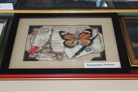 Еще одна особенность экспозиции – нет ограничений в тематике работ: есть и прекрасные пейзажи, и портреты, и репродукции картин известных художников, и иконы, и натюрморты, и игрушки, есть даже салфетки, связанные на шестигранных пяльцах. Здесь работы как большого размера, так и совсем маленькие, строгие, классические по тематике произведения сочетаются с веселыми, шуточными, как например, изображения героев мультфильмов. Наряду со взрослыми свои работы на суд посетителей выставили и дети.