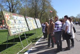 По площади Революции установлены стенды «Солдаты Победы», где со старых фотографий смотрят победители – участники Великой Отечественной войны.