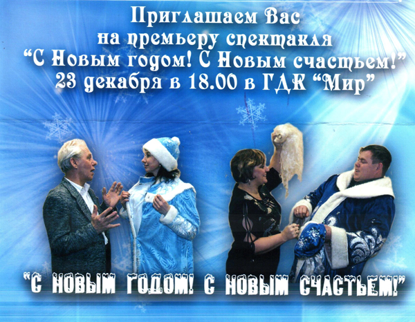22 декабря 2012 года любительское театральное объединение «Маска» ГДК «Мир», представит харовскому зрителю новогодний спектакль «С Новым годом! С новым счастьем!» по пьесе вологодского автора А.Лукьянова, режиссер-постановщик Татьяна Скворцова. Действие происходит в обычном городе с обычными людьми в канун новогодней ночи. Новогодняя ночь – это ночь чудес, где все меняется местами и сказка становится явью. Эта теплая комедия убеждает зрителя в том, что возраст не помеха для поисков любви и счастья.