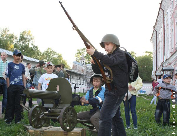 Недавняя военная история была представлена у Западной стены Кремля Вологодским поисковым отрядом. Его участники, одетые в форму солдат Великой Отечественной войны, демонстрировали оружие солдат Красной армии и рассказывали о работе отряда.