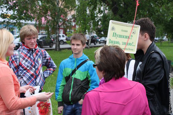 Сотрудники Вологодской областной юношеской библиотеки провели интерактивную акцию «Пушкин? Знаю, знаю!». Её участниками стали прохожие, которым было предложено ответить на ряд вопросов, касающихся жизни и творчества поэта. Ко Дню русского языка было приурочено начало работы читального зала под открытым небом, где все желающие могли ознакомиться с новинками газет, журналов и книг прямо в парке.