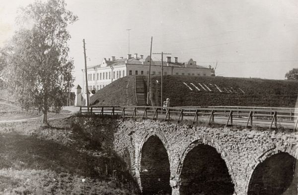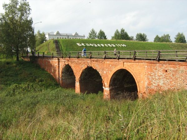 Трехарочный кирпичный мост через ров расположен в западной части древнего Белозерского городища и восточным концом выходит в начало улицы III Интернационала. План моста имеет текучие формы: он плавно расширяется к центру и к выходам на валы рва. Самые узкие его части «укреплены» плоскими лопатками. Три большие арки одинаковой высоты, средняя из которых шире боковых, опираются на два прямоугольных в плане пилона, вытянутых по оси север-юг, и мощные откосы. Пилоны от пят арок, отмеченных карнизом в виде плинта, расширяются к основанию. Боковые арки имеют полуциркулярную форму, а у средней центр несколько понижен. Они декорированы замковыми камнями и плоскими обрамлениями, повторяющими их форму. Парапеты моста деревянные, менялись неоднократно.