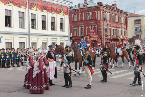 Придя 29 июня на площадку у Красного моста, можно было перенестись из нашего времени в начало XIX века. Именно в тогда, в 1824 году, Вологду посетил император Александр I, которого вологжане торжественно встречали хлебом-солью. Эта сцена стала кульминацией в исторической реконструкции «Плацпарадная площадь». «Императора» чествовали, как подобает: костюмированные «войска» прошли праздничным парадом, которыми когда-то славилась эта площадь. Тогда, в 1824 году, в ходе визита в Вологду Александр I побывал на балу в Дворянском собрании, поэтому очень символичен был полонез, который представители «Академии балов» станцевали не на паркете зала, а прямо на площади. Красочные костюмы, конное шествие и настоящие пушечные залпы остались одним из самых ярких впечатлений этого дня.