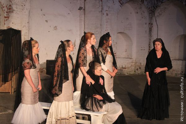 «Дом Бернарды Альбы» – один из немногих спектаклей, сыгранных на фестивале «Голоса истории» под открытым небом. Словацкие артисты выбрали для показа Пятницкую башню. Их спектакль оказался едва ли не самым лучшим в исторических интерьерах. Белеющая на фоне ночного неба башня напоминала колокольню католического собора, сценическая площадка, огороженная с трёх сторон высокими стенами, отчётливо напоминала, что действие пьесы происходит в ограниченном пространстве. Актёрский ансамбль умело обживает новое пространство. Создалась твёрдая уверенность, что мы наблюдаем действие, происходящее в испанском дворике. Эмоции, перипетии сюжета захватывают и вызывают сопереживание. Вот один эпизод: девушки приникают к стене, будто бы рассматривая, что же происходит на свободе. И у зрителя создаётся полное ощущение, что они видят свободных людей, тем самым приобщаясь к внешнему миру, вырываясь из домашнего плена. Таким образом, северная архитектура помогла словацкому театру создать необходимую атмосферу для более точного эмоционального восприятия спектакля зрителем.