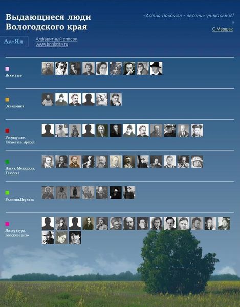 В разделе каждый сможет найти интересующую его информацию (материалы о жизни и деятельности, полные тексты произведений, фото, видео и аудиоматериалы) о писателях, ученых, художниках, музыкантах, государственных и общественных деятелях, предпринимателях: Константине Батюшкове, Николае Рубцове, Варламе Шаламове, Василии Белове, Ольге Фокиной, Николае Амосове, Иване Милютине, Василии Верещагине, Валерии Гаврилине, Семене Дежневе, Христофоре Леденцове, Иване Коневе, Николае Клюеве, Сергее Ильюшине, Алексее Пахомове, Владимире Корбакове, Игнатии Брянчанинове, Александре Башлачеве, Алексее Мордашове и многих других.