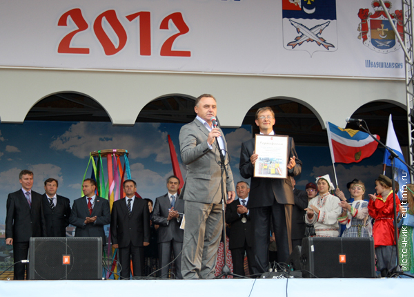 Глава города Вологды Евгений Шулепов приехал на праздник не с пустыми руками: от имени всех вологжан он подарил юбилярам сертификат на строительство детского городка.