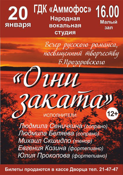 …«Мы только знакомы», «Вам 19 лет», «Я не вернусь», «Мой табор», «Кольца», «Газовая косынка», «Вернись», «Караван», «Левкои», «Корабли», «Плачет рояль», «Мы оба лжем», «Жигули», «Я старше вас», «Никому ничего не рассказывай» - все эти и еще более ста романсов, составляющих сокровищницу этого жанра, создал композитор, чье имя известно лишь поклонникам романса, а биография и поныне практически не исследована. Борис Алексеевич Прозоровский. Его творчеству посвящен вечер русского романса «Огни заката».