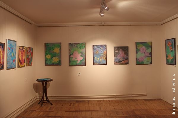 А волшебные «Птица-сказка» и «Птица-мечта», кажется, вот-вот вспорхнут с картин и действительно подарят всем окружающим исполнение самых заветных желаний. «Дракон-змей» – символический образ, соединяющий в себе год ушедший и год наступивший, словно бы этот необычный персонаж, родившийся в воображении художницы, несет в день сегодняшний капельку счастья всем, кто его созерцает. Или же «Рыба-солнце» – яркая обитательница подводного мира, где на самой дальней глубине благодаря ей заиграли огненные краски. Но, пожалуй, центральное место в экспозиции отводится флоре: стрелиция, маки, кизил, подсолнух, сиреневый лотос, кувшинки… такие необычные яркие и в тоже время нежные. Именно цветоводство – одно из любимых занятий художницы, на ее даче каждое лето появляются новые сорта цветов, поэтому ее «портреты» растений выполнены с особой любовью.
