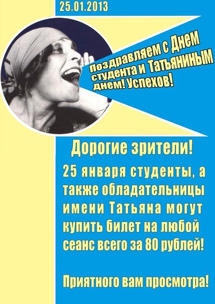 Центральные кинотеатры Вологды «Ленком» и «Салют» поздравляют студентов и Татьян с праздником! 25 января 2013 года для них в кинотеатрах будут действовать специальные предложения.