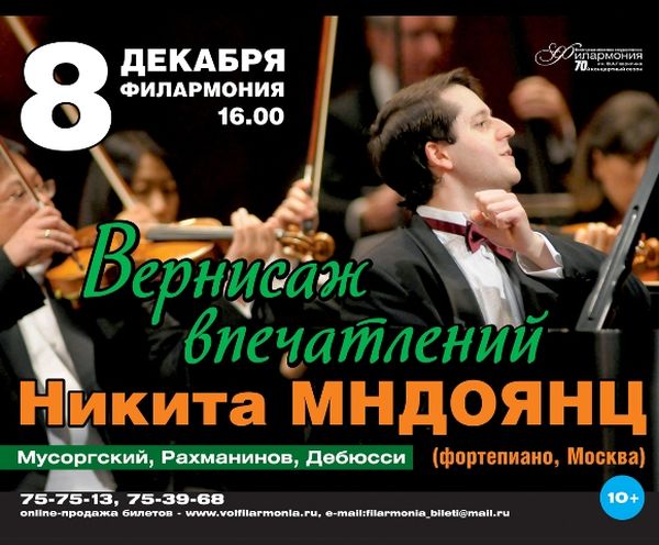 Пианист, солист Московской филармонии Никита Мндоянц 8 декабря 2013 года представит свою программу «Вернисаж впечатлений» в областной филармонии им. В.А. Гаврилина. Начало концерта в 16.00. Программа Никиты Мндоянца – это собрание шедевров мирового фортепианного репертуара. Первое отделение посвящено одной из наиболее ярких страниц русской фортепианной классики – сюите М.П. Мусоргского «Картинки с выставки», написанная в память о друге композитора – художнике и архитекторе Викторе Гартмане. Собрав все рисунки, акварели, проектные работы, эскизы, Мусоргский организовал выставку творчества В. Гартмана и написал к ней музыкальное сопровождение. Во втором отделении концерта прозвучат произведения С. Рахманинова и К. Дебюсси. Этюды-картины Рахманинова – это во многом последние великие этюды романтической музыки. Эти сочинения – уникальный перекресток традиций XIX и XX веков. Композитор сам назвал их «этюды-картины», поскольку всегда получал сильные музыкальные импульсы от зрительных впечатлений. Пять прелюдий Дебюсси, выбранных пианистом, отличаются яркой образностью и подчеркнут особую тональность фортепианного вечера. Информация Вологодской областной филармонии | ||
