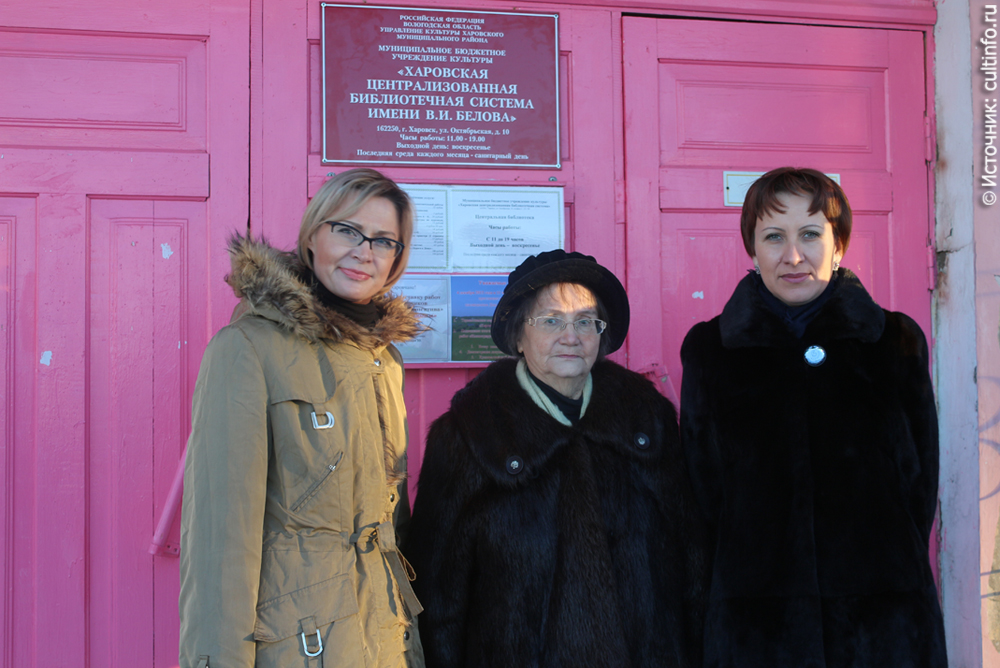 Почитатели таланта писателя собрались перед зданием Харовской ЦБС. В этот день над дверями городской библиотеки появилась вывеска с его именем. Почетное право снять полотно с памятной доски было предоставлено вдове Василия Ивановича Ольге Сергеевне Беловой.
