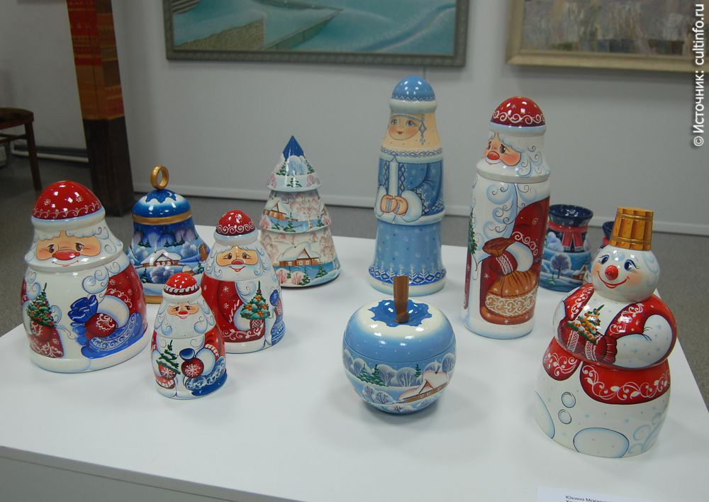 Украсили выставку деревянные расписные игрушки, созданные руками мастеров ООО НХП «Надежда» и произведения художников по эмали предприятия народных художественных промыслов ООО «Творческая мастерская "Вологодская финифть"».