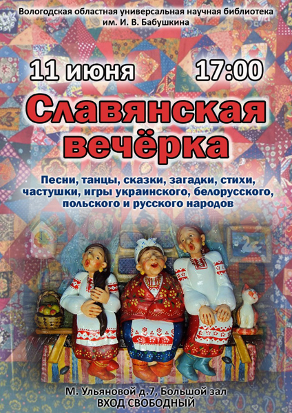 «Как только окончатся работы в поле,… Мероприятие необычного формата «Славянская вечёрка» состоится 11 июня 2013 года в 17.00 в Большом зале Вологодской областной универсальной научной библиотеки на ул. М. Ульяновой, 7. Форма праздника выбрана не случайно. Россия – традиционно многонациональное государство. Она тесно связана с фольклорными традициями славянских народов. Вечерние посиделки у славян были, как правило, приурочены к осенне-зимнему периоду. На них сначала работали, а потом отдыхали – пели, танцевали, рассказывали смешные и страшные истории, играли. На посиделки собиралась молодежь, особенно незамужние и неженатые парни и девушки. На «Славянскую вечёрку» в областную библиотеку придут вологжане – представители славянских народов, среди которых русские, поляки, украинцы, белорусы. Украинские «вечорныци» плавно перейдут в белорусские «вечарынки», а польские «оберачки» продолжатся русскими «посиделками». Гостям мероприятия будет предложена интересная программа, в которую вошли украинские, польские, белорусские и русские народные песни, танцы, загадки, игры. Мы приглашаем всех желающих быть гостями «Славянской вечёрки» в Вологодской областной библиотеке! Вход свободный.