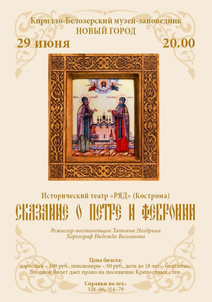 Акция «Белые ночи» состоится в Кирилло-Белозерском музее-заповеднике В день города Кириллова – 29 июня 2013 года – Кирилло-Белозерский музей-заповедник приглашает вологжан на акцию «Белые ночи в музее». В 20 часов на территории Нового города состоится выступление исторического театра «РЯД» из Костромы, который под открытым небом покажет спектакль «Сказание о Петре и Февронии».