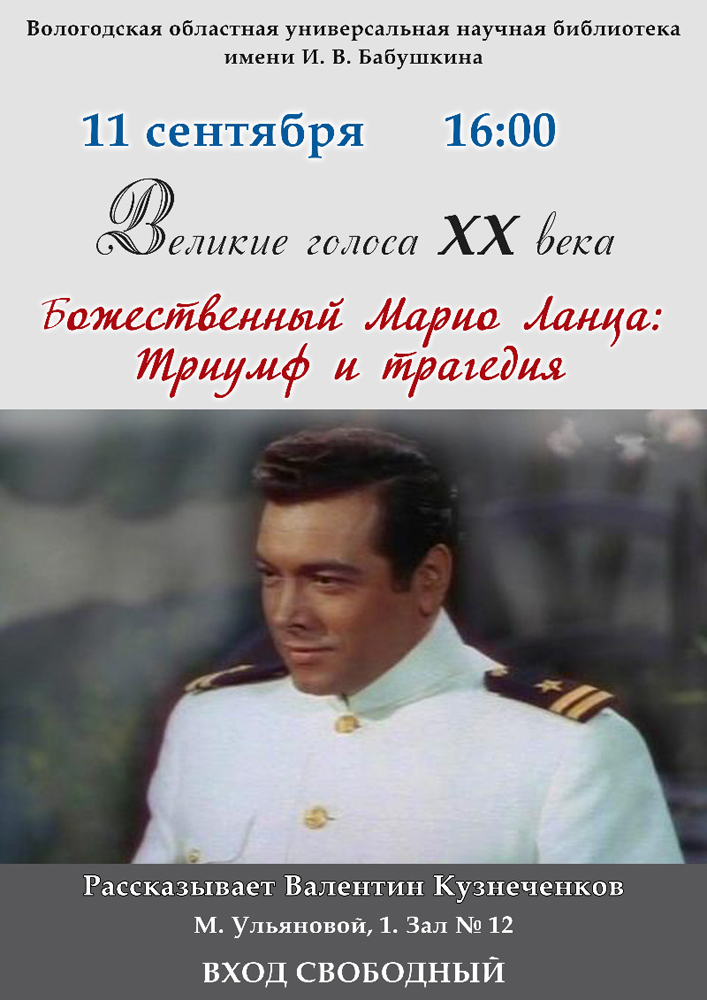 11 сентября 2013 года Вологодская областная универсальная научная библиотека приглашает всех меломанов на вечер «Великие голоса XX века. Божественный Марио Ланца: Триумф и трагедия». О нелёгком пути гениального тенора расскажет искренний любитель музыки, знаток творчества Марио Ланца, вологжанин Валентин Кузнеченков. Многолетний поклонник таланта великого артиста познакомит публику не только с важными моментами биографии певца, но и представит отрывки из фильмов и концертов с его участием. Марио Ланца родился в Пенсильвании (США), а скончался в столице Италии - Риме, в самом зените славы, когда ему было 38 лет. Он учился петь под записи Энрико Карузо. Молодой талант заметил Сергей Кусевицкий и помог получить профессиональное образование. Слава певца росла вместе с вокальным мастерством. Его мощный голос и эмоциональная манера пения позволяли исполнять любые партии. Итальянец по крови, он стал ярчайшим образцом истинно итальянского вокального искусства. Яркая внешность Марио Ланца и природный артистизм открыли ему