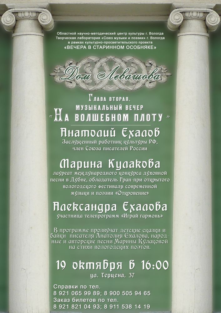 19 октября 2014 года в доме Левашова состоится музыкальный вечер «На волшебном плоту». Он продолжает программу . Начало в 16.00. Вторую главу проекта откроют заслуженный работник культуры РФ, член Союза писателей России Анатолий Ехалов; лауреат международного конкурса духовной песни в Дубне, обладатель Гран-при открытого вологодского фестиваля современной музыки и поэзии «Откровение», автор-исполнитель Марина Кулакова. В программе прозвучат детские сказки и байки писателя Анатолия Ехалова, народные и авторские песни Марины Кулаковой на стихи вологодских поэтов. Проект «Вечера в старинном особняке» подготовлен в рамках Года культуры в России Областным научно-методическим центром культуры и творческой лабораторией «Союз музыки и поэзии». Справки по тел.: 8 (921) 065-99-89.