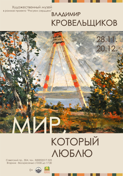 Живописные работы художника-любителя Владимира Кровельщикова (1924-1988), выполненные в жанрах пейзажа, портрета и натюрморта, вошли в экспозицию «Мир, который люблю» Художественного музея Череповецкого музейного объединения. Открытие выставки состоится 28 ноября 2014 года в 16.00.