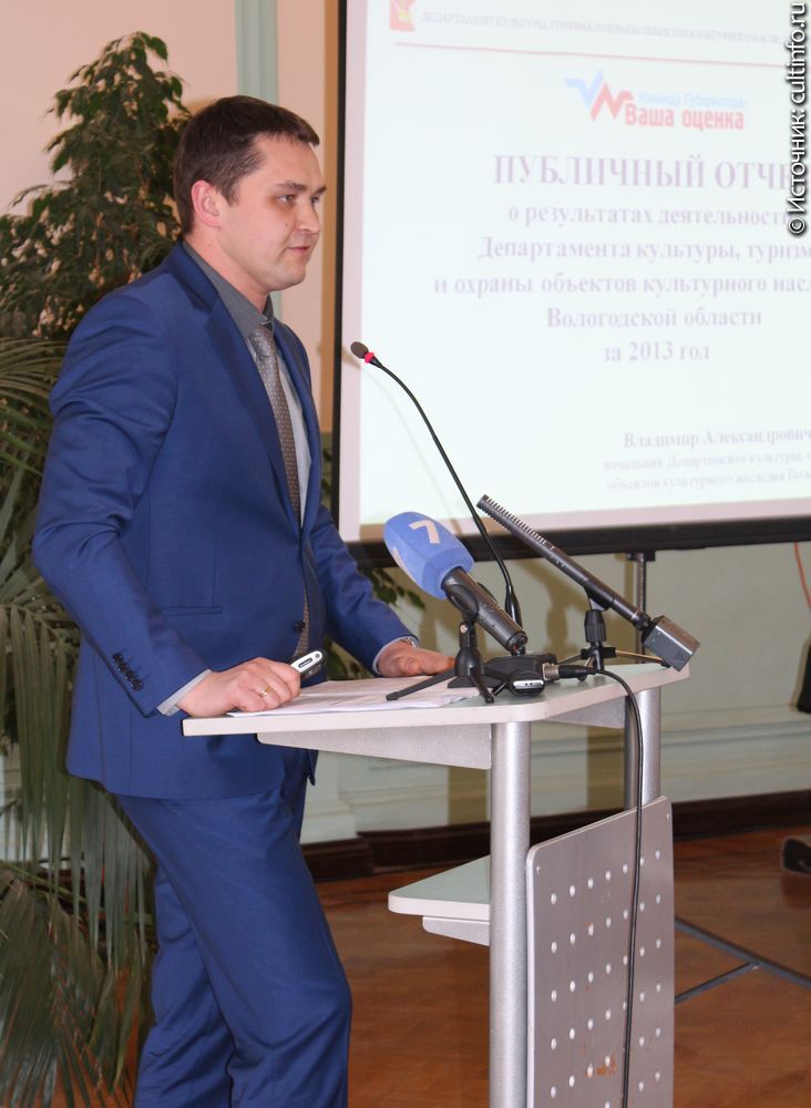 25 февраля 2014 года состоялся публичный отчет начальника Департамента культуры, туризма и охраны объектов культурного наследия Вологодской области Владимира Осиповского. Отчет представлен в рамках реализации проекта «Команда Губернатора: Ваша оценка». На публичном отчете в здании Вологодской областной универсальной научной библиотеки присутствовали эксперты проекта «Команда Губернатора: Ваша оценка», члены общественного совета при Департаменте культуры, туризма и охраны объектов культурного наследия Вологодской области, представители органов исполнительной и законодательной власти области, представители Вологодской городской Думы, руководители органов управления культуры муниципальных образований области, руководители государственных и муниципальных учреждений культуры, туризма и архивного дела. Публичный отчет прошел в формате конструктивного диалога. Напомним, что с 1 января этого года в ведении Департамента, помимо сферы культуры и охраны объектов культурного наследия, находятся сфера туризма и архивное дело. Владимир Осиповский, возглавивший объединенный Департамент, представил собравшимся результаты работы по всем направлениям деятельности за 2013 год, обозначил вектор работы на 2014 год: задачи и проблемы, пути решения которых предстоит найти. Вологодская область по ряду показателей развития сферы культуры входит в тройку лидеров Северо-Западного федерального округа. Во многом это обусловлено богатым культурным наследием региона, высоким профессионализмом работников культуры и наработками прошлых лет. В 2013 году были утверждены государственные программы на 2014-2018 годы: «О сохранении и развитии культурного потенциала», «О развитии туристского кластера», «О развитии архивного дела». В 2014 году их предстоит объединить в одну большую государственную программу, которая позволит осуществлять комплексный подход к развитию этих отраслей. В 2013 году, несмотря на сокращение финансирования сферы культуры из областного бюджета, отрасль работала стабильно. Во исполнение майских указов Президента РФ Правительством области была разработана и утверждена «дорожная карта», или План мероприятий, направленных на повышение эффективности сферы культуры. К сожалению, установленных показателей по повышению заработной платы работников культуры в муниципальных образованиях достичь не удалось. В 2014 году планируется произвести структурный анализ расходов и достичь запланированного уровня повышения оплаты труда. Привлечение средств из федерального бюджета в сферу культуры осуществляется в рамках федеральной целевой программы «Культура России» на 2012 – 2018 гг. В 2013 году все муниципальные библиотеки получили доступ к автоматизированной библиотечной системе OPAC GLOBAL, благодаря чему у пользователей появилась возможность работать со сводным электронным каталогом. Все библиотеки вели активную просветительскую деятельность по продвижению чтения. В музеях области продолжена работа по созданию единого сводного каталога музеев Вологодской области. На 1 января 2014 года информационные системы учета и ведения каталогов используются во всех музеях области. В электронные каталоги занесено около 38% совокупного музейного фонда. Укреплению единого культурного пространства региона способствовала реализация проекта «Культу