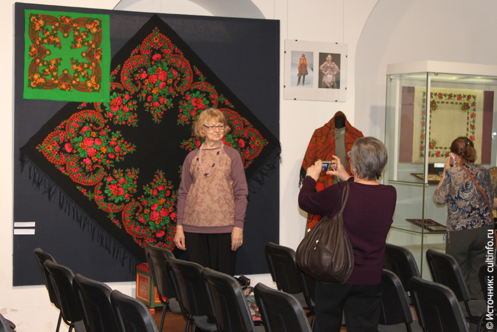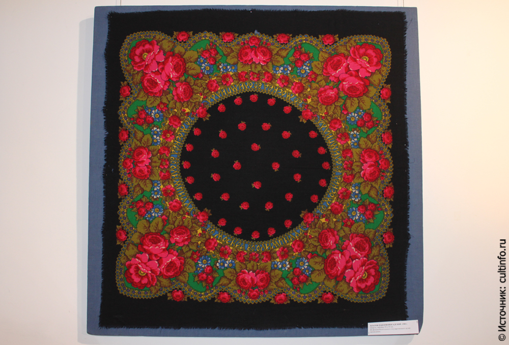Цветы России на ваших плечах 27 марта 2014 года открылась выставка «Павловопосадские платки» в художественном отделе Вологодского государственного музея-заповедника. Экспозиция знакомит с искусством набивных платков второй половины ХХ – начала ХХI века подмосковного города Павловский Посад. Выставку смело можно назвать настоящим праздником цветов и цвета: на платках и шалях расцветают роскошные букеты красных, бордовых, розовых роз и георгинов, скромные голубые незабудки и синие полевые колокольчики сплетаются в затейливые гирлянды, поражают своей тонкостью восточные узоры. Традиционный павлопосадский платок способен преобразить даже самый скромный наряд. Многие дамы, присутствовавшие на открытии, с гордостью демонстрировали свои павлопосадские «сокровища». Кроме шалей и платков различных размеров на выставке представлены костюмы и платья, сшитые или декорированные павлопосадскими платками. Большинство экспонатов из личных коллекций. Экспозиция удачно дополнена другими произведениями русских народных промыслов – жостовскими подносами, хохломскими игрушками и посудой, полхов-майданскими матрешками, филимоновской игрушкой, палехскими шкатулками. Тему выставки поддержал музыкальный дуэт заслуженной артистки России пианистки Елены Распутько и певицы Янины Труканавичюте, в исполнении которого прозвучали известные песни «Подари мне платок» и «Синий платочек». Елена Николаевна сыграла пьесу «Апрель. Подснежник» из цикла «Времена года» П. И. Чайковского. История платочного предприятия в старинном городе Павловском Посаде насчитывает больше двух столетий. Но знаменитые на весь мир павловопосадские платки и шали здесь стали выпускать не сразу. Их производство было налажено купцами Яковом Лабзиным и Василием Грязновым в начале 60-х годов XIX века – спустя полвека с момента основания фабрики. Сегодня платки и шали занимают особое место среди известных всему миру изделий, составляющих гордость и славу России. Ежегодно «Павловопосадская платочная мануфактура» выпускает около 400 видов шалей, платков, шарфов, кашне, палантинов, скатертей из натуральных волокон: шерсти, хлопка, шелка. Предприятию придан статус народного художественного промысла России. За более чем вековую историю на платочной мануфактуре сложилась единственная в своем роде павловопосадская школа платочного рисунка. Работа над каждым новым изделием начинается с рисунка (крока), выполненного на ватмане гуашью. При этом изображается только та часть рисунка, которая в платке повторяется: четверть, половина, реже платок рисуется полностью. Над рисунком художник работает в течение двух месяцев. Все подготовленные кроки рассматриваются и утверждаются Художественным советом, на который приглашаются заслуженные художники предприятия, представители Министерства культуры РФ и Художественно-экспертного Совета Московской области по народным художественным промыслам. Как только рисунок утвержден, к работе над ним подключаются колористы. Их задача – подобрать рецепты печатных красок, добиваясь как можно более точного воспроизведения с помощью текстильных красителей авторского рисунка, выполненного гуашью. Каждый рисунок печатается в нескольких цветовых вариантах – колоритах. В зависимости от сложности рисунка применяются различные способы на