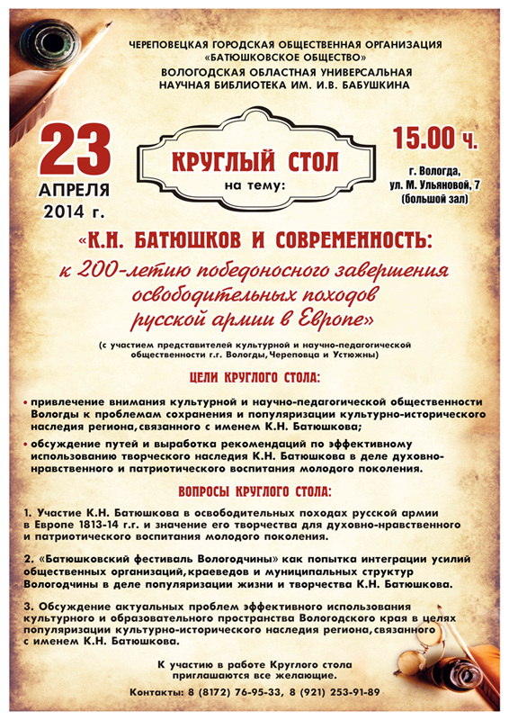 Круглый стол на тему «Батюшков и современность: к 200-летию победоносного завершения освободительных походов русской армии в Европе» пройдет 23 апреля 2014 года в Большом зале Вологодской областной библиотеки (М. Ульяновой, 7). Начало в 15 часов.