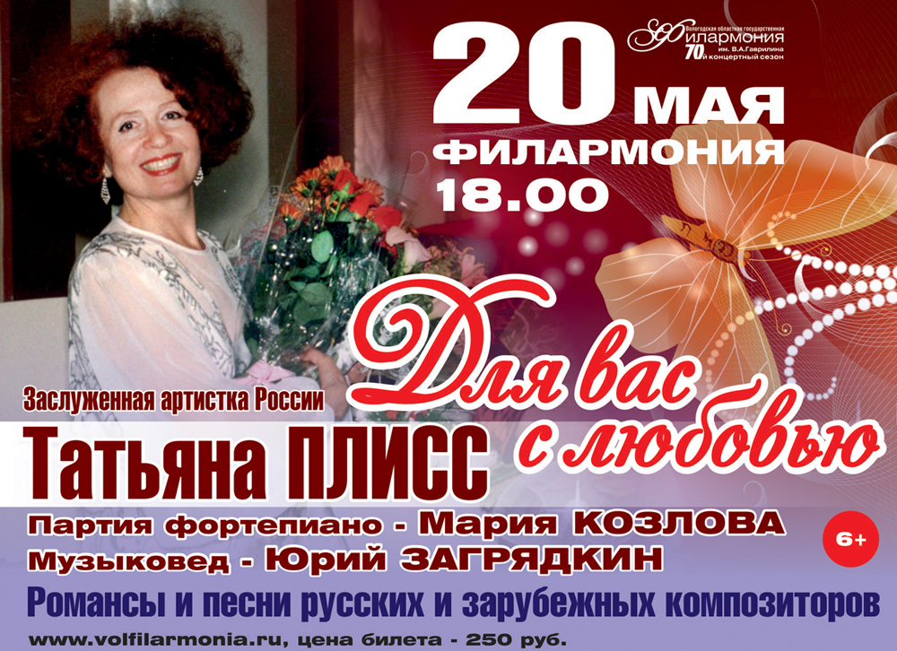 Татьяна Плисс (сопрано) В программе: романсы и песни русских и зарубежных композиторов. Богат и разнообразен репертуар солистки Вологодской областной филармонии заслуженной артистки РФ Татьяны Плисс. Эту артистку хорошо знают и любят в нашем городе. А она всегда отвечает своим поклонникам взаимностью. Неслучайно в программу концерта «Для вас с любовью» певица включила любимые многими вологжанами популярные романсы П.И.Чайковского, С.В.Рахманинова и Н.А.Римского Корсакова, песни современных композиторов, старинные русские романсы. Начало в 18.00. Информация Вологодской областной филармонии | ||