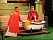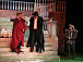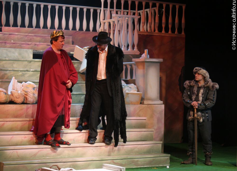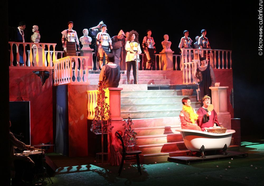 …Что делать мыслящему человеку, если ему «выпало в империи родиться»? Только кур разводить. Почти все действие спектакля проходит под аккомпанемент кудахтанья. Императорский дворец превратился в курятник. Император Ромул (Эдуард Аблавацкий), сидя на краю ванны, обтирает свежие яички чистой тряпочкой. Казалось бы, он равнодушен ко всему на свете, кроме своих кур, которые все названы именами римских императоров, а одна – в честь германского князя Одоакра. В комичном диалоге со слугами звучит горькая ирония над «императорской долей», хотя говорят они о курах: как ни кукарекай, все равно в итоге – в суп или на сковородку. И от былого величия Римской империи остались только мраморные бюсты императоров прошлого, которые Ромул потихоньку сбывает антиквару – нужны же императору деньги, чтобы заплатить повару…