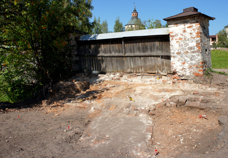 В Кирилло-Белозерском музее-заповеднике ведутся археологические раскопки Сохранение памятников истории и культуры всегда тесно связано с их изучением. Хроника Кирилло-Белозерского монастыря хорошо известна, и экскурсоводы музея охотно делятся фактами из жизни обители с туристами. Тем не менее, исследования не прекращаются. На данный момент на территории Кирилло-Белозерского музея-заповедника сразу в нескольких местах проходят археологические раскопки. О том, с какой целью ведутся эти работы, и что интересного удалось найти, в интервью для kirmuseum.ru рассказал директор научно-исследовательского центра «Древности» Илья Папин. – Илья Валерьевич, чем сейчас занимаются специалисты вашего центра в музее? – Перед нами стоят две задачи, которые мы решаем параллельно. Первая – это надзор или, правильнее сказать, археологическое наблюдение за реставрационными работами. На центральной площади ведутся большие работы по благоустройству территории: перекладка дорожек, вертикальная планировка. Мы следим за тем, как проводятся земляные работы. В случае обнаружения объектов, имеющих археологическую ценность, мы должны приостановить строительство, обследовать участок и принять решение: необходимо проведение полноценных исследований или нет. Результат уже есть: в начале лета между Братским корпусом и церковью Епифания было обнаружено несколько погребений. Мы определили контуры могил, нанесли их на план. В связи с этой находкой в проекте по благоустройству территории произошли изменения. Было принято решение зонировать кладбище и не прокладывать в данном месте дорожку, как задумывалось первоначально. – Какова вторая задача? – Вторая наша задача – это как раз раскопки. Архитекторами готовится новый генеральный план Кирилло-Белозерского монастыря, вместе с тем специалисты разрабатывают проект реставрации стен XVI века. По этой причине мы производим предварительный зондаж территории. Цель – уточнить местоположение монастырских построек, которые сейчас не существуют или сохранились частично. На данный момент работы ведутся у Святых врат Ивановского монастыря, также мы расчищаем остатки Круглой башни. – Места раскопок выбираются целенаправленно? – Мы работаем, ориентируясь на планы, описи, различные документы. Археология – это достаточно трудоёмкое и затратное дело, чтобы раскапывать территорию вслепую. Необходимо сначала «прицелиться». В случае с вратами Ивановского монастыря всё было просто: в стене хорошо видны заложенные кирпичом проёмы. В описи 1601 года говорится, что в этом месте стояла квадратная двухэтажная проездная башня. У нас есть большая уверенность в том, что разобрали её достаточно рано. Хорошо видны на поверхности и остатки кладки Круглой башни. Сложнее с локализацией мельницы, которая упоминается в монастырских описях. Предположительно, она находилась на углу Братских келий в районе современного мостика через речку. Эта территория сама по себе интересна: в XVI-XVII веках здесь рядом стояли Круглая башня, мельница, далее ещё одна башня и стены Острога. Мы постараемся определить, где именно располагалась мельница. – Рядом с местом раскопок у стен Ивановского монастыря лежат поднятые из земли кирпичи. Они представляют какой-либо интерес?